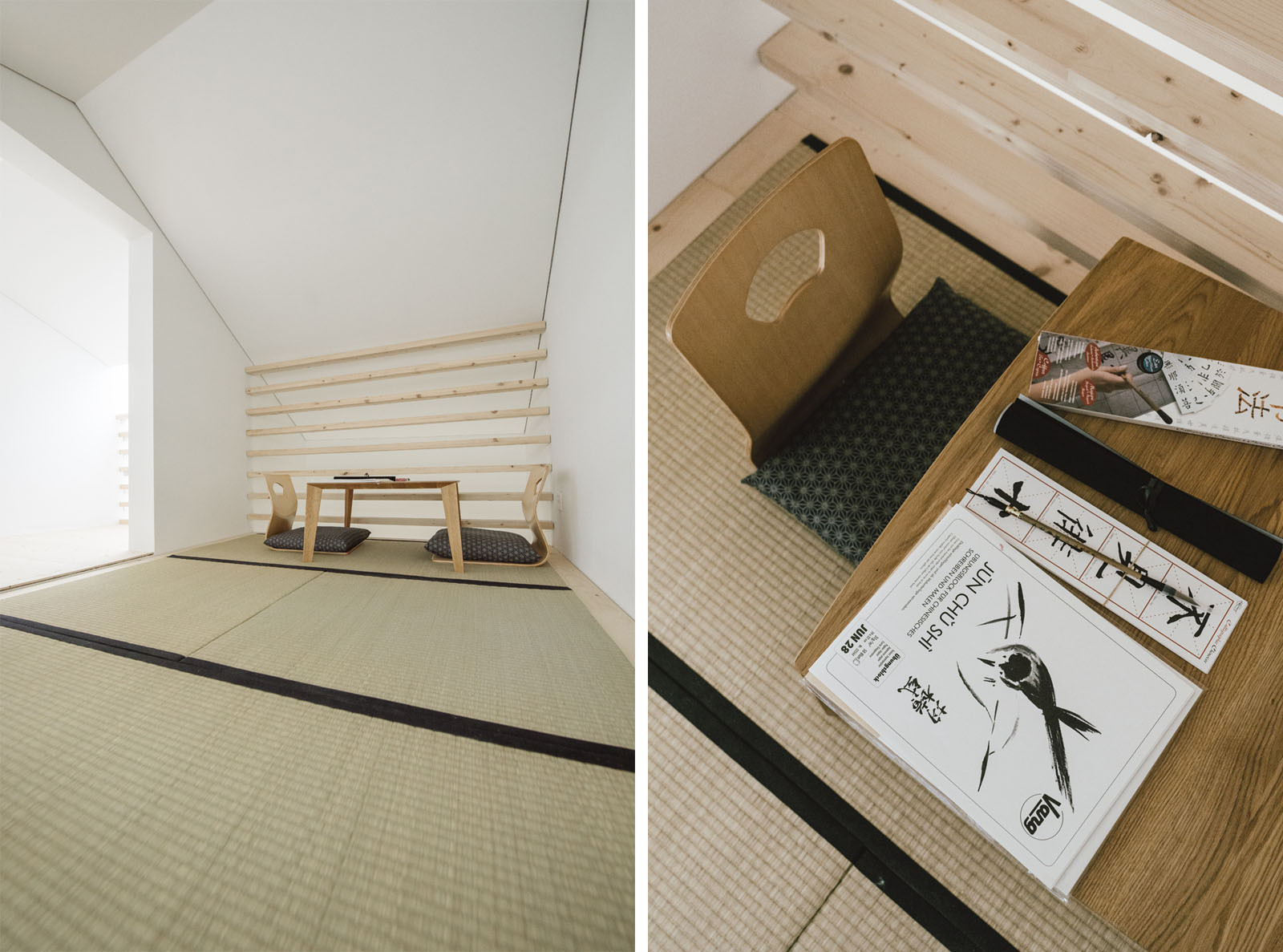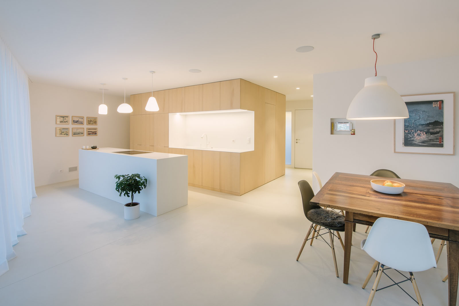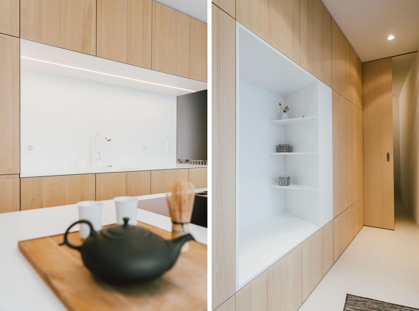 Auch bei dem Innenausbau galt der Leitsatz „weniger ist mehr“. Die Bauherrschaft, beides ausgesprochene Japan-Liebhaber, hat sich für eine zurückhaltende Einrichtung mit möglichst wenig verschiedenen Materialien entschieden. Durch ein ausgeklügeltes Smart-Home Konzept sind sämtliche elektrischen Gebäudeinstallationen (Licht, Storen, Musik, Heizung, Lüftung) miteinander vernetzt. Dank dieser Ausführung werden einerseits Alltagsvorgänge komfortabel automatisiert, andererseits können die Geräte-Einstellungen z.B. von Lichtszenen und Musik, per Computer oder Smartphone schnell an die persönlichen Bedürfnisse angepasst werden – zuhause oder unterwegs. Die wenigen Bedienstellen im Innenbereich unterstreichen zudem die reduzierte Architektur zusätzlich.