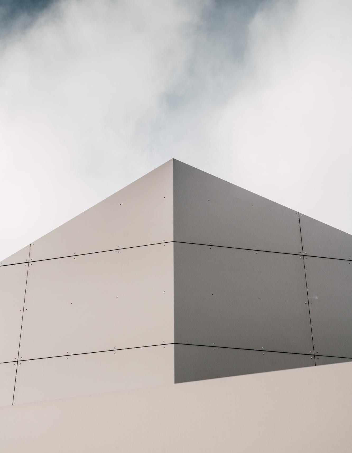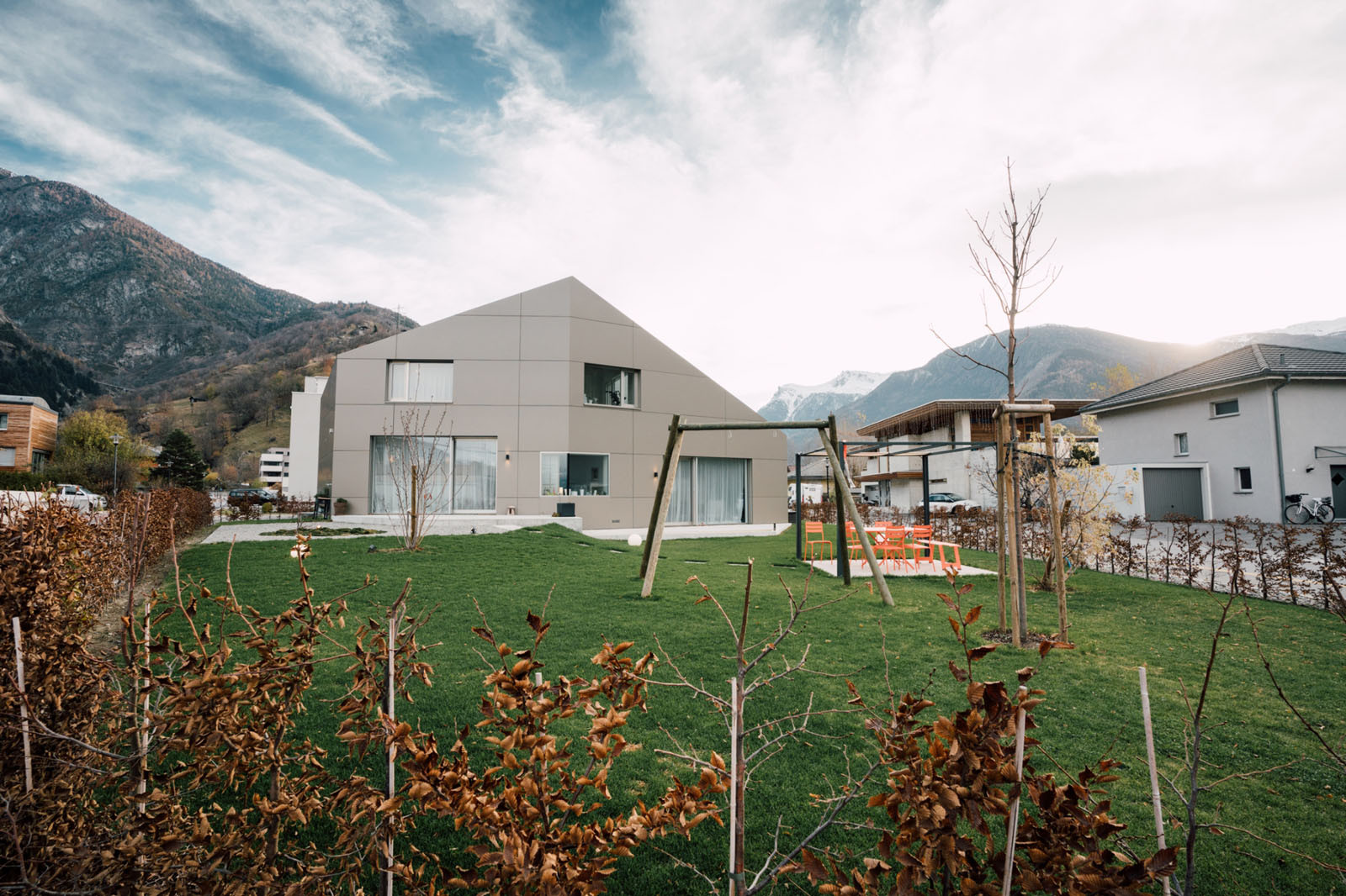 Der monolithische Bau, welcher auf einem 6-Eck aufgebaut ist, entstand quasi aus einem Guss & überzeugt mit seiner klaren und schlichten Formsprache. „All you need is less“ war von Beginn an der Leitsatz, der dieses Projekt prägen sollte. Auch in der Gestaltung der Aussenhaut hat man sich für ein durchgehendes Material entschieden. Das Dach wurde als fünfte Fassade angesehen und so sind sowohl die Fassade als auch das Dach mit grossformatigen Aluminiumverbundplatten verkleidet.