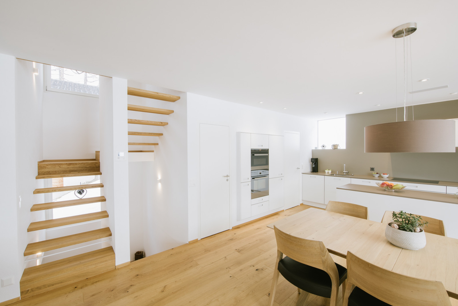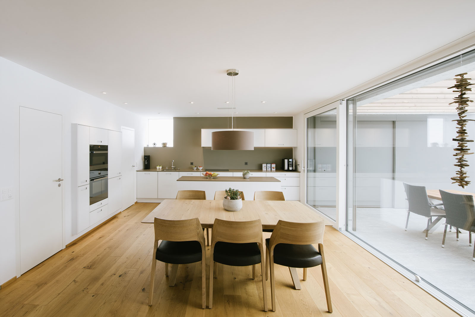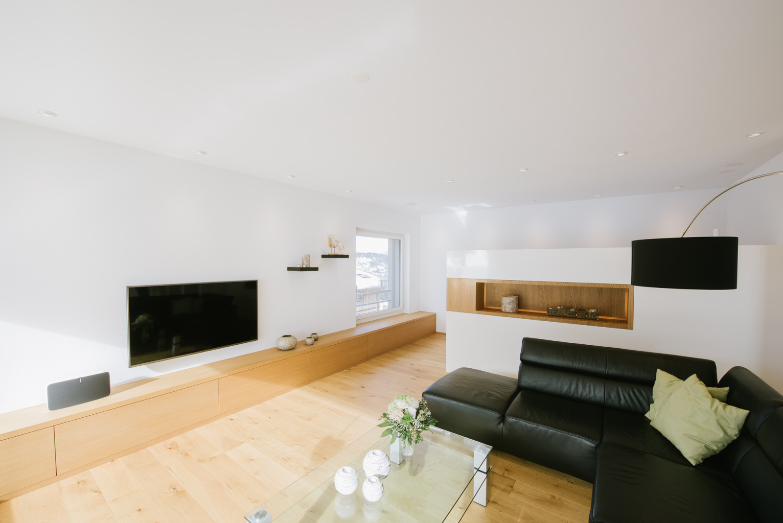 Das neue Zuhause der vierköpfigen Familie betritt man aufgrund der Hanglage durch das Garagengeschoss. Im darüber liegenden Untergeschoss befindet sich der Eingangsbereich mit Garderobe sowie die allgemeinen Räumen. Eine zweiläufige Treppe führt ins Erdgeschoss und ermöglicht, oben angekommen, bereits den ersten Ausblick auf die Berglandschaft. Die offene Küche mit angrenzendem Wohnbereich und Speicherofen bildet den Wohnmittelpunkt der Familie. Eine über Eck geführte Panoramaverglasung eröffnet einem eine einmalige Fernsicht auf die Walliser Alpen. Im Dachgeschoss sind zwei identische Kinderzimmer sowie das grosszügige Familienbad mit Elternbereich untergebracht. Der Innenausbau folgte dem Motto „weniger ist mehr“ und so hat man sich für eine zurückhaltende Einrichtung mit wenig verschiedenen Materialien entschieden. Aussen wurde das Haus mit einer Lärchenholzschalung verkleidet. Die einzelnen Holzlamellen unterscheiden sich dabei in ihren Abmessungen und wurden jeweils versetzt zueinander angebracht.