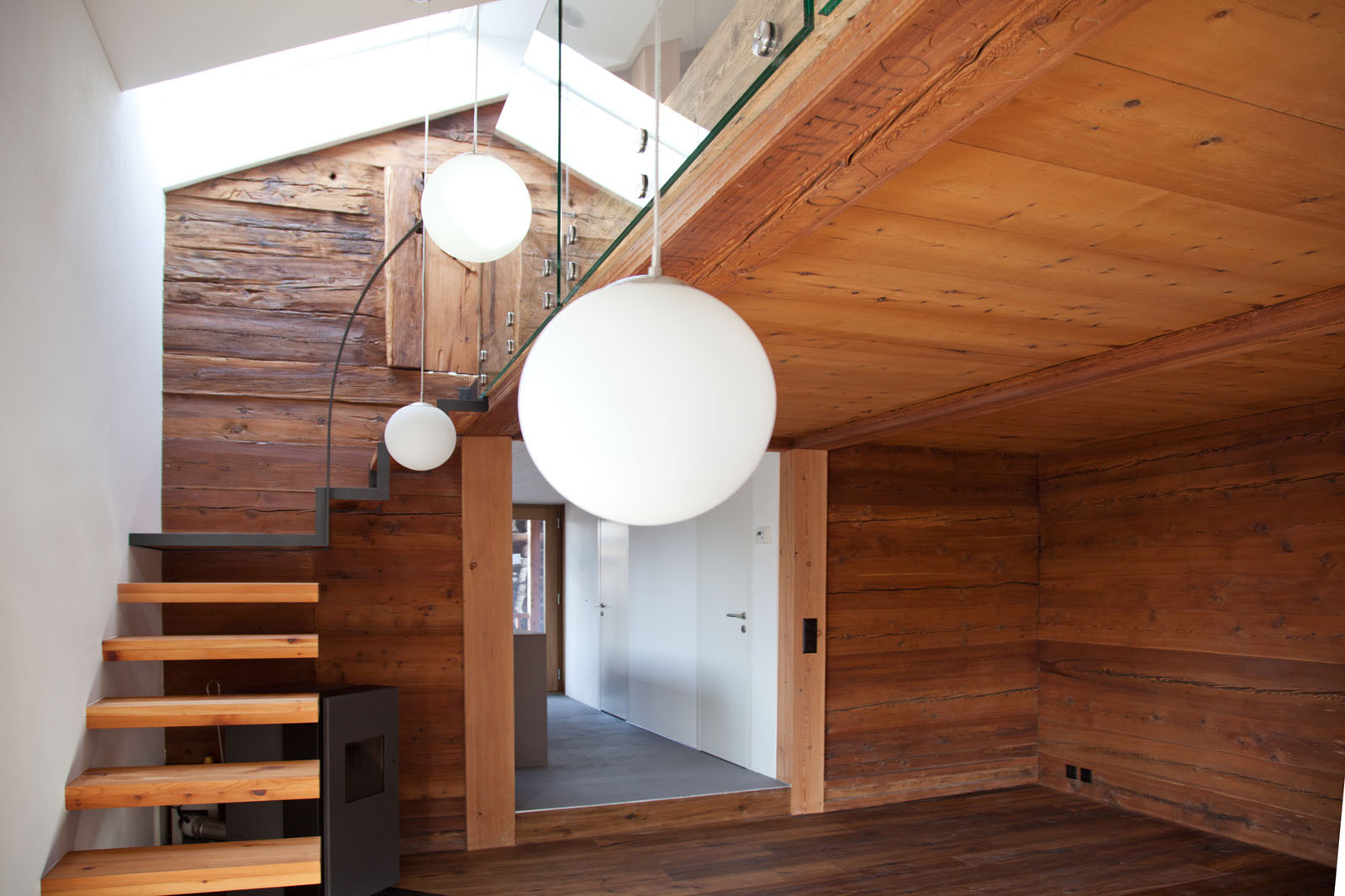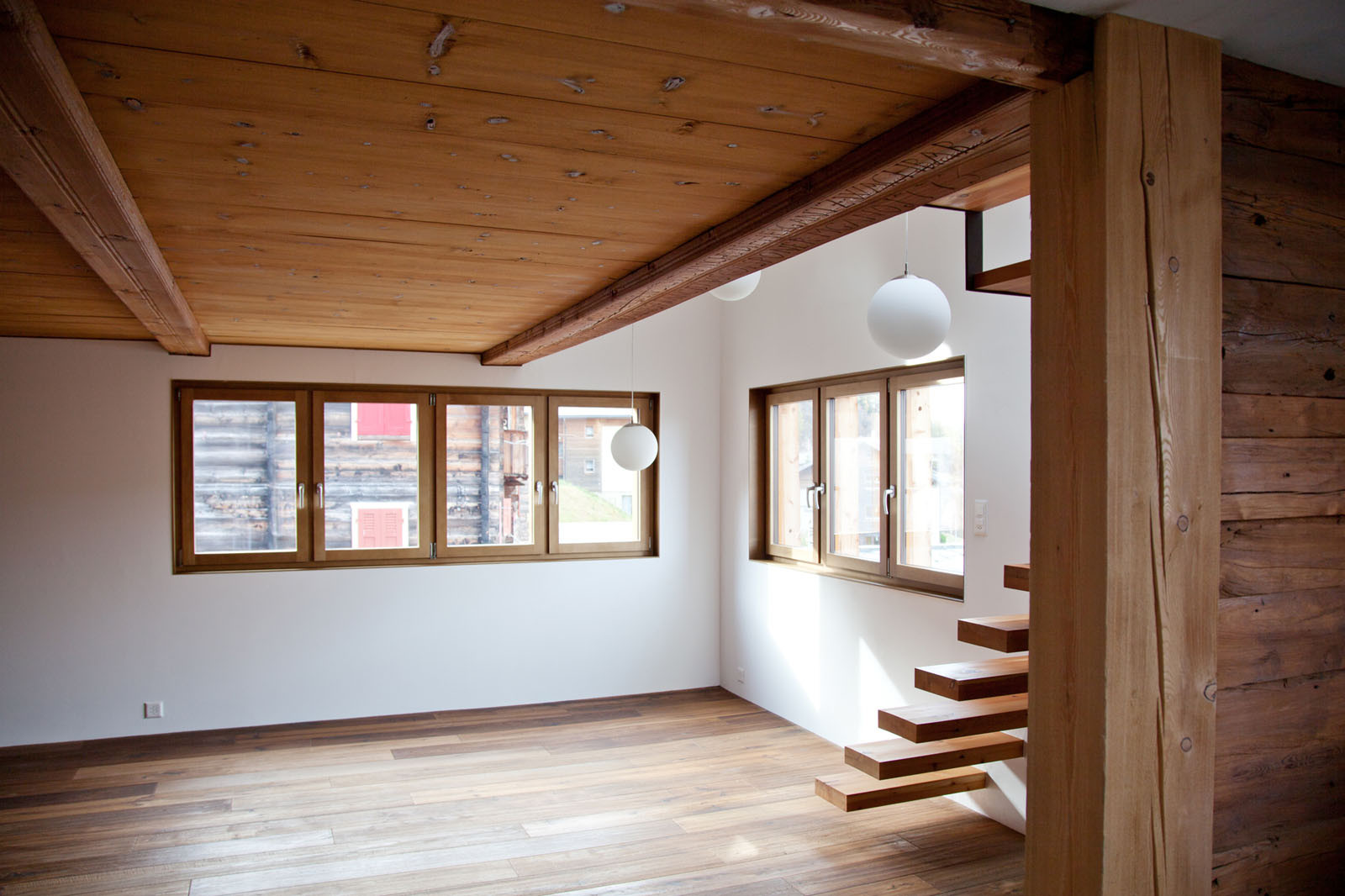 Am Herrenviertelplatz im alten Dorfkern von Visperterminen hauchte das BAUATELIER12 einem Wohnhaus von 1773 neues Leben ein. In enger Zusammenarbeit mit der kantonalen Denkmalpflege wurden im 2. Obergeschoss zwei attraktive Wohnungen geschaffen. Bei dem Wohnhaus mit regionaler Bedeutung handelt es sich um einen zweigeschossig gestrickten Blockbau auf verputztem Sockel. Das bis anhin unbewohnte und als Estrich genutzte Dachgeschoss wurde in den Entwurf mit einbezogen und beherbergt neu die Schlafräume der Familie. Im Obergeschoss sind währenddessen die Allgemeinräume untergebracht. Die Schnittlösung im Wohnraum mit interner Erschliessung sorgt für spannende Sichtbezüge. Die energetische Sanierung wurde unter Einhaltung heutiger Standards und dem Einbezug von erneuerbaren Energiequellen ausgeführt. Beheizt werden die Wohnungen mittels stationärem Holz-Pellet Ofen und die Warmwasseraufbereitung geschieht über eine thermische Solaranlage. Die beiden Wohnungen, welche dauerhaft bewohnt sind, tragen einen wichtigen Teil zur Wiederbelebung der alten Dorfkerne bei.