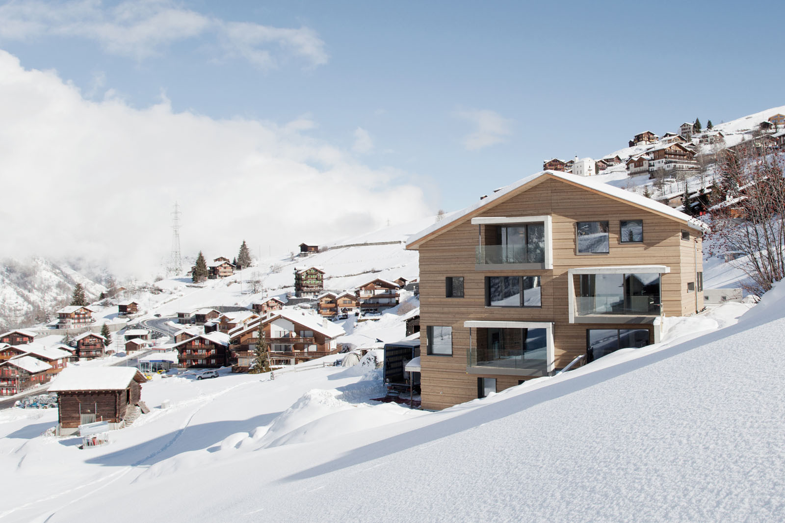 Wie ein Findling steht der Neubau selbstverständlich in seinem unmittelbaren Kontext. Durch die spezielle Holzfassade wird der traditionelle Blockbau neuinterpretiert. Die Materialisierung ist auf Holz und Sichtbeton reduziert. Es entstehen vier grosszügige Ferienwohnungen, Wohlfühloasen mitten in den Walliser Bergen. Die integrierte Loggia lässt den Innenraum mit der Landschaft verschmelzen und ist zugleich ein geschützter Rückzugsort.
