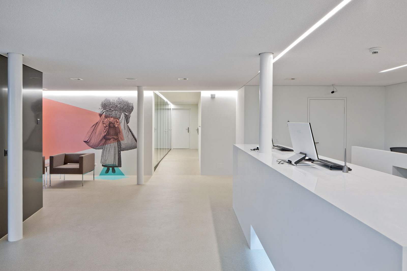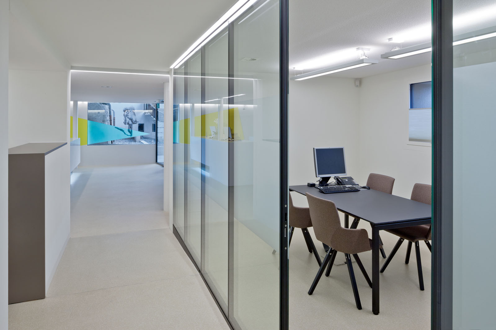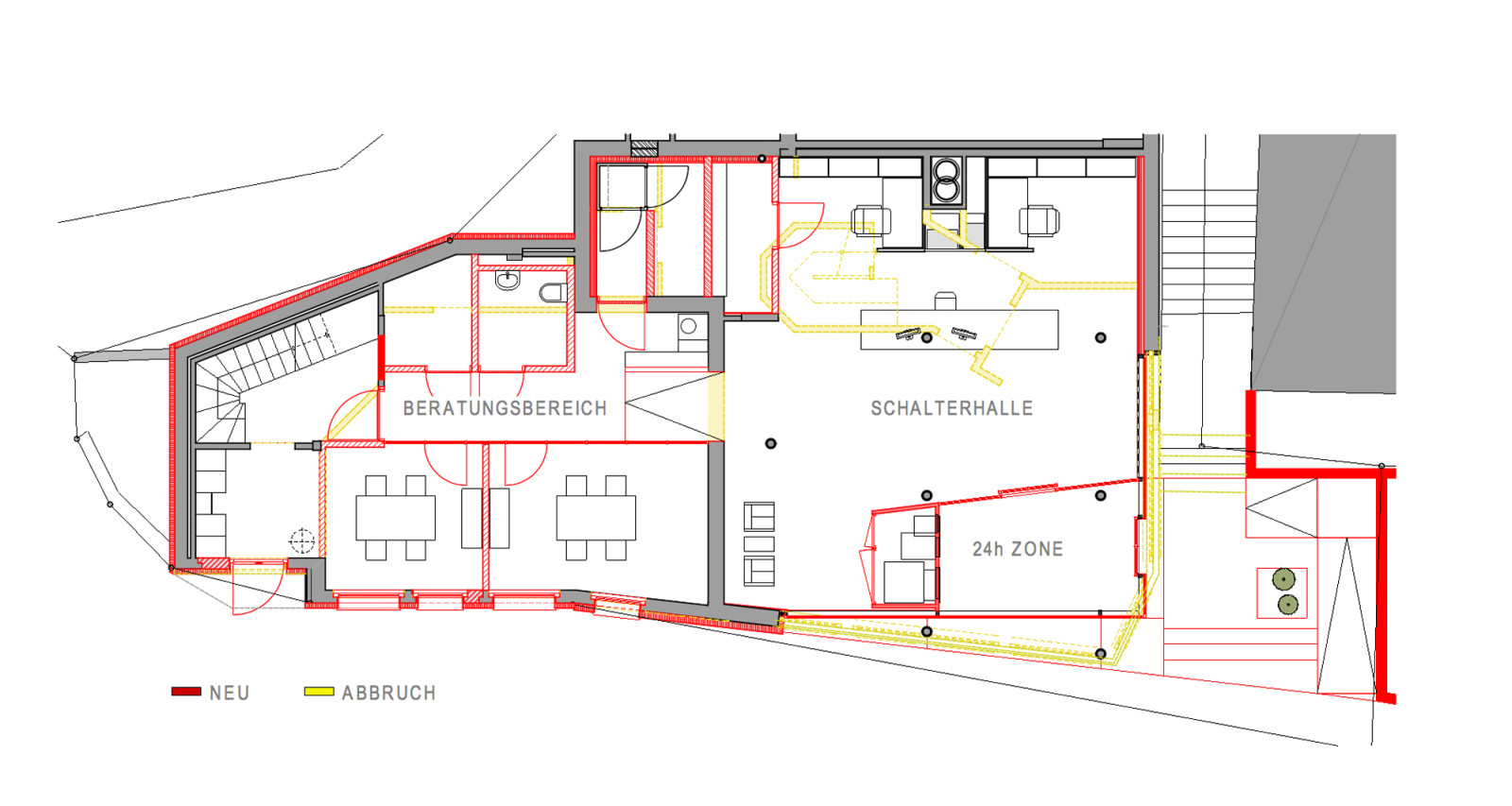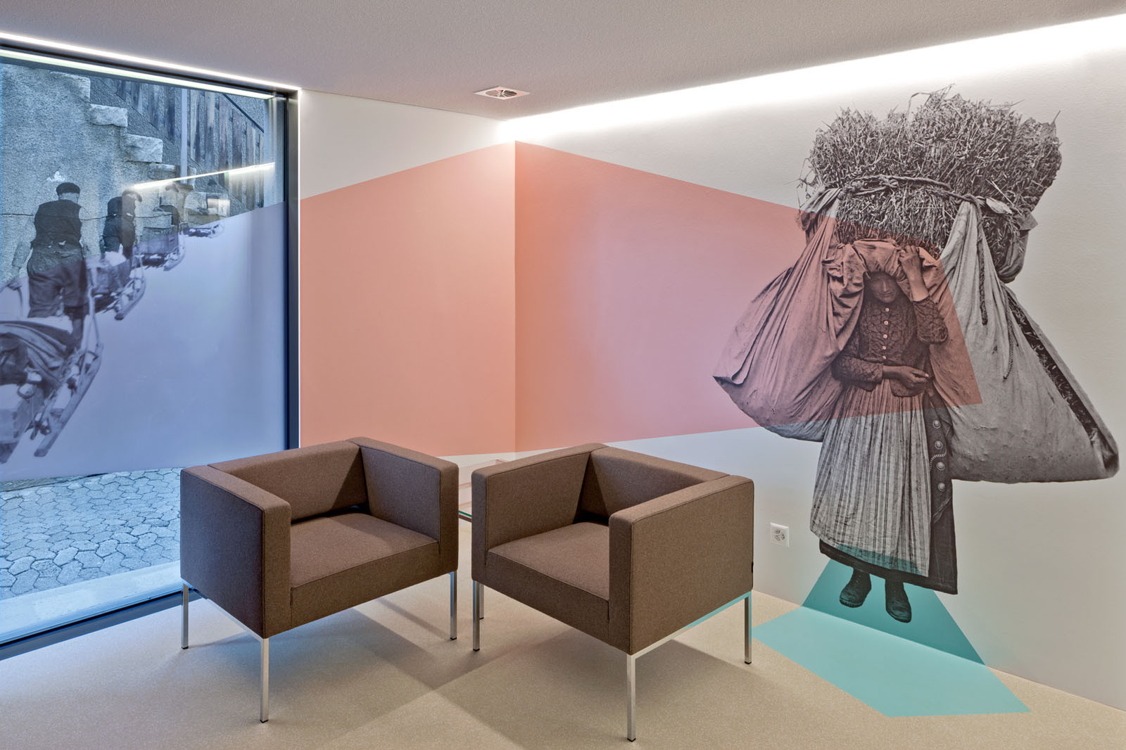 Im Zentrum der Erweiterung der Bank steht der Kunde. So wurde der Schalterraum vergrössert und die Kunden werden neu an einem offenen Schalter empfangen und bedient. Für Bankdienstleistungen stehen im Parterre neu zwei Besprechungszimmer zur Verfügung. Die Mitarbeitenden der Bank können sich an neuen Büros im Obergeschoss und einem geräumigen Sitzungszimmer mit Blick über den alten Dorfkern erfreuen. Unter Berücksichtigung der Grösse der Bank und deren strategischen Zukunftsaussichten wird die nachhaltige Wirtschaftlichkeit des Baus sichergestellt. Für die Kunst am Bau sorgte die Künstlerin Sibylla Walpen mit ihren schönen Arbeiten "Tresor". Dabei schafft sie es, mit den Wandbildern Tradition und Brauchtum mit der zeitgenössischen Architektur in Verbindung zu bringen.